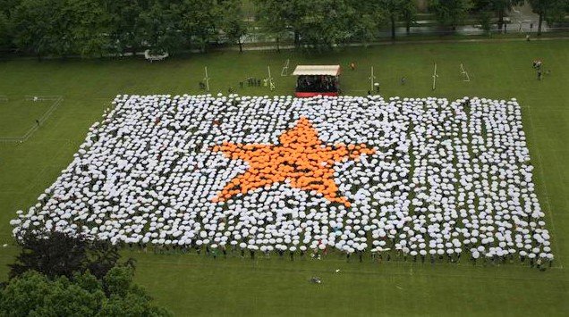 We moesten het veld in één vloeiende actie vullen met 2880 kinderen elk om een aangewezen plaats. Daartoe werd een een grid uitgezet met de paraplu’s (dankzij een bijdrage van gemeente Brasschaat). De kinderen die uit de diverse scholen werden samengebracht werden verdeel in 4 opvang velden. VAn daaruit werden dan tegelijkertijd de 4 stromen elk naar hun eigen vak gevoerd.